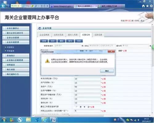 请详细核对“企业信息表”、“出资关系表”和“报关人员表”中的各项信息。黑体字段属可变更内容,灰体字段为不可变更内容,根据本企业当前情况进行信息修改。